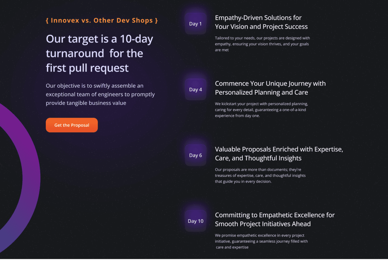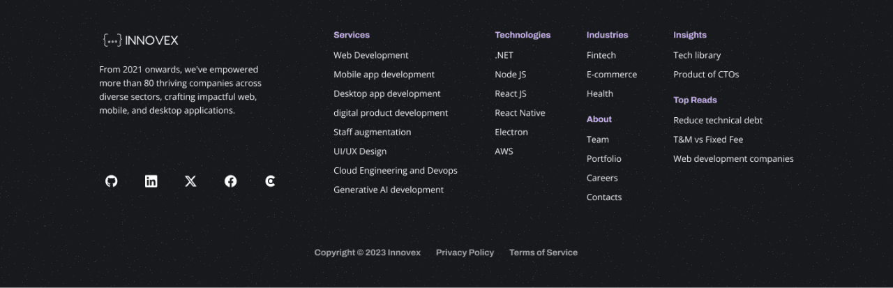 Welcome to Innovex, where digital dreams become reality! Our sleek landing page design speaks volumes about our cutting-edge approach to software development. Engage visitors with intuitive navigation, stunning visuals, and compelling content.
